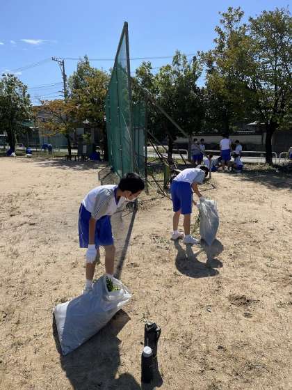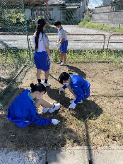 2年・14歳の挑戦・3日目・その1 公開日 2022/09/29 更新日 2022/09/29 2学年 9月29日(木) 10:00 「社会に学ぶ『14歳の挑戦』」の活動を紹介します。 今日は後半1日目です。 昨日まで2日間、事業所で活動していた生徒は、今日から2日間は学校で活動をします。 体育館で、清掃のプロフェッショナルの方の動画を鑑賞した後、グラウンドに出て、除草作業を行いました。 短い時間で集中して作業した結果、グラウンドが一気にきれいになりました!(写真:下)