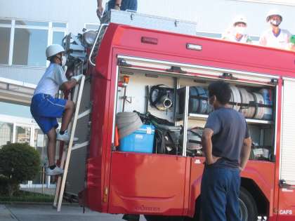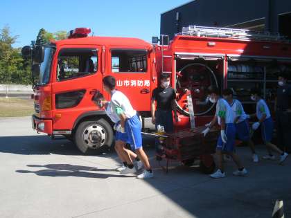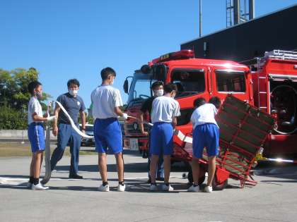 2年・14歳の挑戦・4日目・その3 公開日 2022/09/30 更新日 2022/09/30 2学年 9月30日(金) 10:00 「社会に学ぶ『14歳の挑戦』」の活動を紹介します。 「富山消防署東部出張所」での活動のようすです。 放水ホースの出し入れをしたり、消防車のはしごを登ったりしました。 人の命を守る大変な仕事です。日頃から大きな声で挨拶や返事できるといいですね。