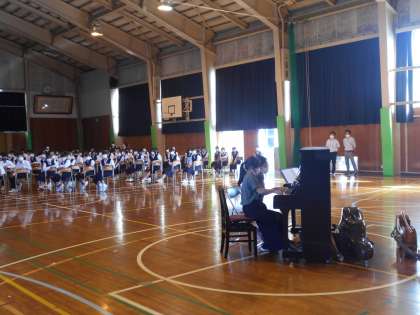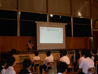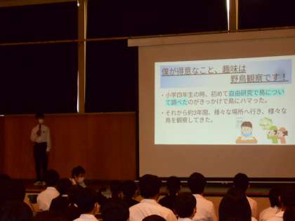 1年・総合・自己開示フェスティバル 公開日 2022/09/30 更新日 2022/09/30 山室中学校のページ 9月30日(金) 6限 1年生は、「自己開示フェスティバル」を開催しました。 クラス発表での代表者がステージで発表し、中には実演した生徒もいました。 お互いの知らないところを再発見するために、全員が一生懸命に聞いていました。 また、発表したのは生徒だけではなく、教員も特技を披露しました!(写真:下)