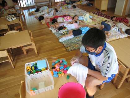 2年・14歳の挑戦・4日目・その9 公開日 2022/09/30 更新日 2022/09/30 2学年 9月30日(金) 14:00 「社会に学ぶ『14歳の挑戦』」の活動を紹介します。 「わかくさ保育園」での活動のようすです。 園児と元気よく遊ぶことはもちろん、おもちゃの消毒等の仕事もしっかりとこなしています。 小さな子供とのコミュニケーションの難しさに、保育士の仕事の大変さを感じていました。