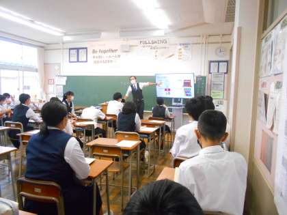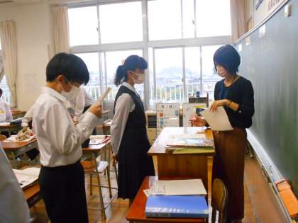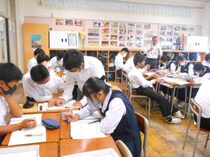 2年・授業風景 公開日 2022/10/05 更新日 2022/10/05 2学年 10月5日(水) 4限 英語では、本文をすらすら読めるように、先生に音読を聞いてもらっています。 (写真 中:2年1組) 社会では、モニターを見ながら、先生の質問に元気に反応しています。 (写真 中:2年2組) 数学では、T1、T2の先生が机間指導で生徒の質問に答えています。 (写真 下:2年5組)