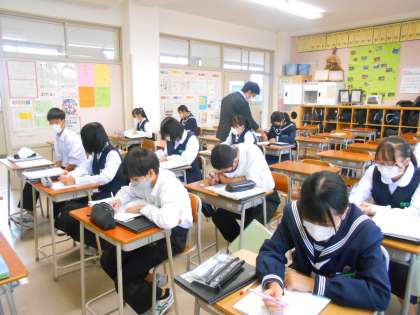 1年・授業風景 公開日 2022/10/07 更新日 2022/10/07 1学年 10月7日(金) 1限 数学では、定期考査に向けてプリントを解きながら腕試しです。 (写真 上:1年1組) 社会では、「高地のくらし」を学習中です。 温帯地方とどのような違いがあるのかな? (写真 中:1年3組) 音楽では、アルトパートが先生と楽譜を確認しながら音取りしています。 (写真 下:1年5組)