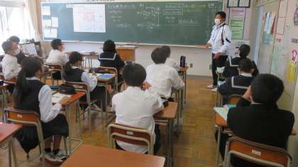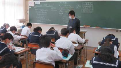1年3組の数学は、少人数で「道のり・速さ・時間」の応用問題に挑戦しています。
