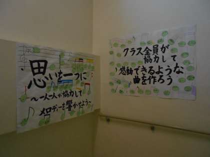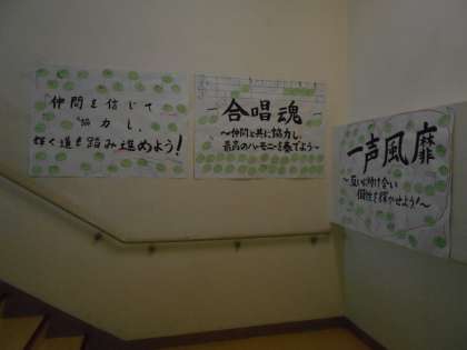 1年生が普段使っている階段に、合唱コンクールの学級スローガンの周りに、個人目標を貼った物を掲示しました。
