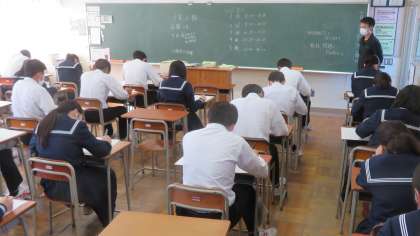 3年・第4回 実力テスト 公開日 2022/10/25 更新日 2022/10/25 3学年 10月25日(火) 1限 社会 3年生は、1〜5限、「第4回 実力テスト」を行っています。 (1限:社会、2限:国語、3限:理科、4限:英語、5限:数学) (写真 上:3年2組 中:3年4組 下:3年6組) そろそろ3年生は、「進路モード」に突入ですね!