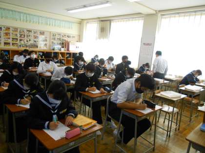 2年・授業風景 公開日 2022/10/26 更新日 2022/10/26 2学年 10月26日(水) 5限 体育では、バスケットボールの試合をしています。 果敢にゴールを攻めています。 (写真 上:2年1、2組) 英語では、過去形の文型について学んでいます。 「過去形の作り方、覚えていますか?」 (写真 中:2年4組) 数学では、1次関数のカラープリントに取り組んでいます。 これまで学んできたことの力試しになりますね。 (写真 下:2年5組)