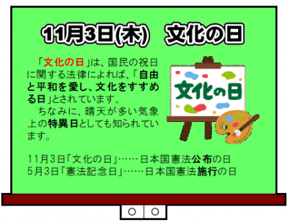 今日は、「文化の日」です! 公開日 2022/11/03 更新日 2022/11/03 山室中学校のページ 11月3日(木・祝) 13:00 気温は22度、天気は晴れ。 今日は、「文化の日」であり、「晴れの特異日」です。 とういうことで、富山は爽やかな秋晴れです!