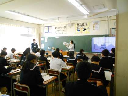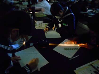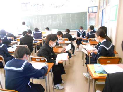 1年・授業風景 公開日 2022/11/07 更新日 2022/11/07 1学年 11月7日(月) 4限 国語では、古文の音読をペアで行って、すらすら読めるように練習しています。 (写真 上:1年1組) 英語では、本文をALTと会話しながら進めています。 (写真 中:1年3組) 理科では、理科室を真っ暗にして光の反射の実験をしています。 (写真 下:1年5組)