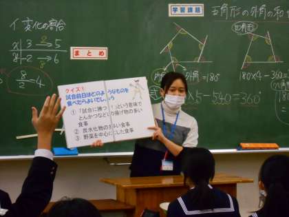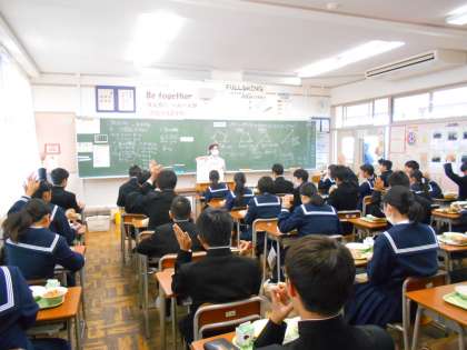 給食時に、南給食センターより栄養士の先生にお越しいただき、スポーツ栄養に関する話をしていただきました。