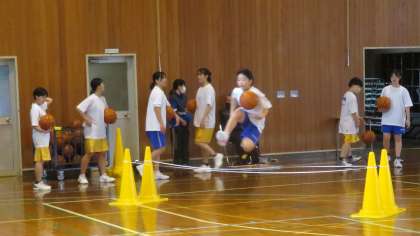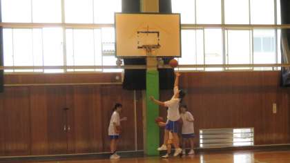 第1体育館では、女子バスケットボール部がシュート練習をしています。