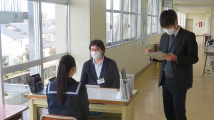 (写真 上:3年4組 英語「スピーキングテスト」)