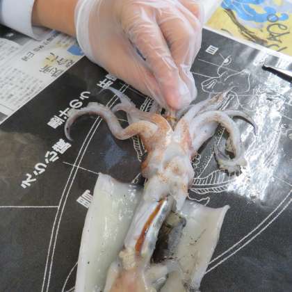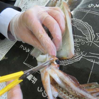2年・理科・イカの解剖と観察 公開日 2022/11/17 更新日 2022/11/17 2学年 11月15日(火) 3限 2年1組の理科は、第2理科室で、軟体動物(イカ)の解剖と観察です。 (写真 上:スポイトを使って、口から醤油を入れて、食道を確認) (写真 下:眼球をとりだし、レンズの役割を確認) どの班も興味津々です!