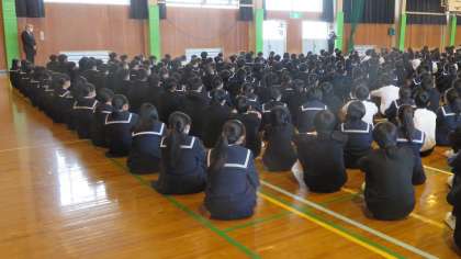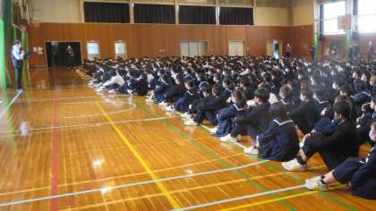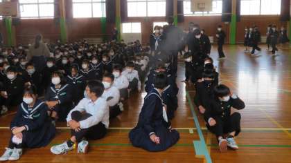 第2回 避難訓練 公開日 2022/11/24 更新日 2022/11/24 山室中学校のページ 11月24日(木) 4限 グラウンドの状態がよくないので、「第2回 避難訓練」は雨バージョンで行いました。 地震が発生したあと、調理室からの出火を想定し、第1体育館に避難しました。 (写真 上:避難のようす 中、下:下山先生の講話) 無言で、迅速に行動することができました。