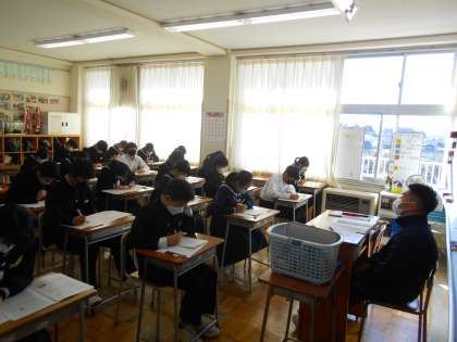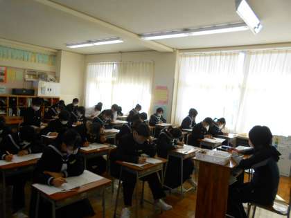 2年・第3回定期考査・3日目 公開日 2022/11/25 更新日 2022/11/25 2学年 11月25日(金) 2限 理科 今日は、「第3回定期考査」3日目です。 これまでの勉強の成果を精一杯発揮してください! (写真 上:2年3組 中:2年4組 下:2年5組)