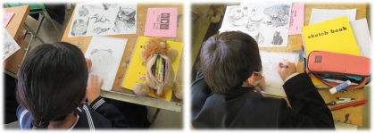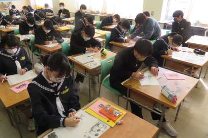 2年2組の美術は、アートガラスの下書きをトレーシングペーパーに写しています。(写真)