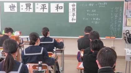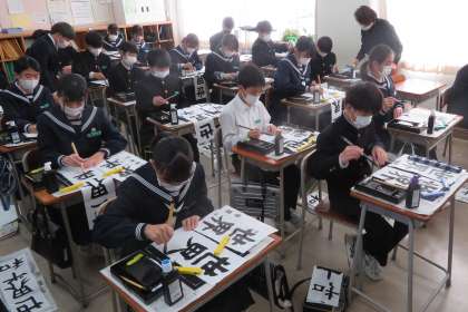 12月7日(水) 1限 1年2組の国語は、書き初め「世界平和」の練習です。 世論を反映した言葉ですね!
