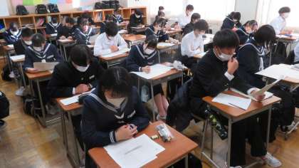 (写真 下:人権作文を真剣に読んでいる3年6組のようす)