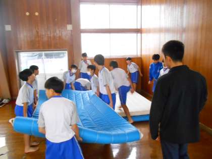 男子の体育は、マット運動をしています。