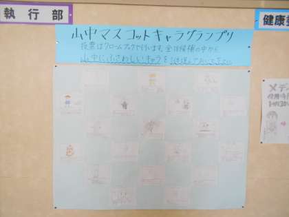 生徒会掲示板には、文化委員より、定期考査を終えての全校アンケート集計の結果、執行部からは生徒会マスコットキャラクターグランプリのお知らせが貼ってあります。
