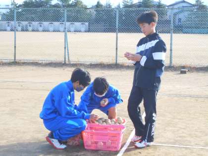 ソフトテニス部は、雨が残るコートの整備やボールの点検をしてから練習開始です。