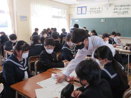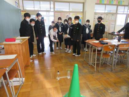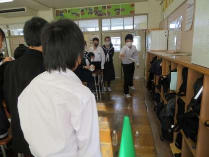1年・学年レクリエーション・その2 公開日 2022/12/21 更新日 2022/12/21 1学年 12月21日(水) 3限 みんな仲良く励まし合って、ゲームに盛り上がっていました。 (写真 上;班のクイズの正解数を数えている1年5組) (写真 中;輪投げをする1年3組) (写真 下;輪投げをする1年4組)