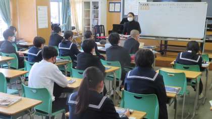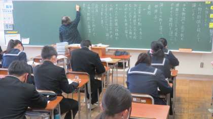 (写真 上:2年1組 国語「平家物語・扇の的」)