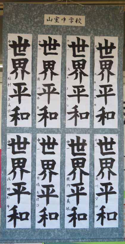 1年・書き初め大会の結果 公開日 2023/01/11 更新日 2023/01/11 1学年 1月11日(水) 昨日の書き初め大会の結果が廊下に掲示されています。 (写真 上:1年2組 下:1年3組) また、市書写展覧会への出品作品も掲示されいました。(写真:中) (※8作品の内訳は、金賞5作品、銀賞3作品です。) 力作が勢揃いですね!