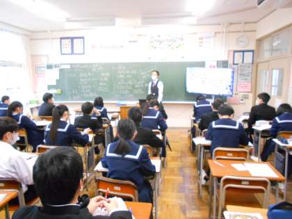 2年・授業風景 公開日 2023/01/16 更新日 2023/01/16 2学年 1月16日(月) 1限 国語では、故事成語の文法や訳について学習しています。 大まかな意味を理解することができましたか? (写真 上:2年1組) 英語では、本文を暗唱しています。 4回しっかりと言えたらSIT DOWN!です。 (写真 中:2年2組) 社会では、市民革命が人々の生活にどのような影響を与えたのかについて話し合っています。 (写真 下:2年4組)