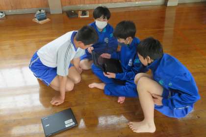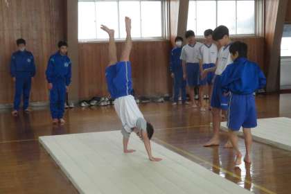 1年・体育・マット運動 公開日 2023/01/20 更新日 2023/01/20 1学年 1月20日(金) 3限 1年3,4組男子の体育は、第2体育館で、マット運動をしています。 ロンダートに挑戦したり(写真:上、下)、自分の動きをクロムブックで撮影してもらい、分析したり(写真:中)しています。
