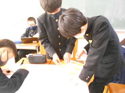 2年・総合的な学習的な時間 公開日 2023/01/20 更新日 2023/01/20 2学年 1月20日(金) 6限 2年生では郷土富山について調べています。 各クラスでも、「観光」「産業」等のテーマを設け、各班が課題を立てて取り組んでいます。 学級発表、学年発表に向けて模造紙で資料作ったり、クロームブックで発表原稿を考えたりしています。 (写真 上:2年1組 中:2年3組 下:2年5組)