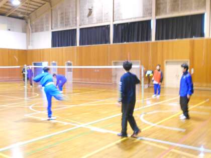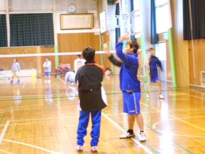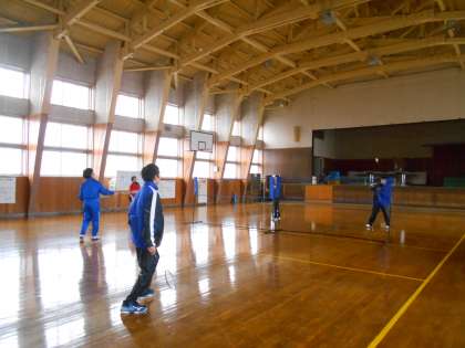 第1体育館、第2体育館を広く利用して、男子バドミントン部が練習しています。