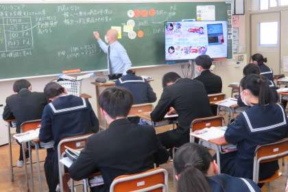(写真 上:3年1組 社会「円高・円安」)