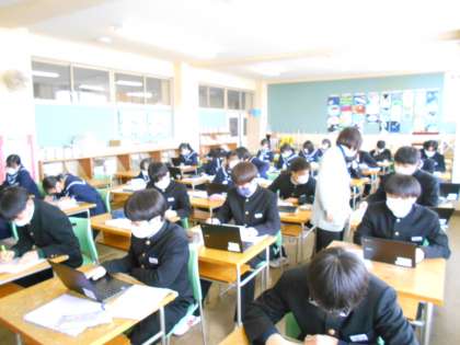 3年・授業風景 公開日 2023/01/27 更新日 2023/01/27 3学年 1月27日(金) 3限 美術では、篆刻のデザインを考えています。 生徒によっては5つも考えた人もいます! (写真 上:3年1組) 音楽では、卒業式で歌う歌の練習をしています。 本番まで歌を磨き上げていきます。 (写真 中:3年2組) 数学では、1、2年生の復習をプリントでしています。 T1、T2の先生がいるので、質問しています。 (写真 下:3年6組)