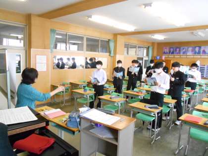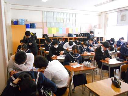 3年・授業風景 公開日 2023/01/27 更新日 2023/01/27 3学年 1月27日(金) 3限 美術では、篆刻のデザインを考えています。 生徒によっては5つも考えた人もいます! (写真 上:3年1組) 音楽では、卒業式で歌う歌の練習をしています。 本番まで歌を磨き上げていきます。 (写真 中:3年2組) 数学では、1、2年生の復習をプリントでしています。 T1、T2の先生がいるので、質問しています。 (写真 下:3年6組)