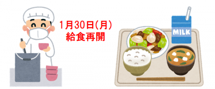 1月30日(月)から給食を再開します! 公開日 2023/01/27 更新日 2023/01/27 お知らせ 1月27日(金) 13:30 1月30日(月)から給食を再開します。 2日間、お弁当の準備ありがとうございました!