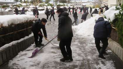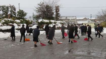 除雪当番の1年4組とボランティアの生徒で除雪しました。