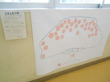 各自、学級や学年、学校のためによい行いができた場合、ピンクの用紙に記入して、クラス前に掲示してあるりんごの木に貼っていきます。