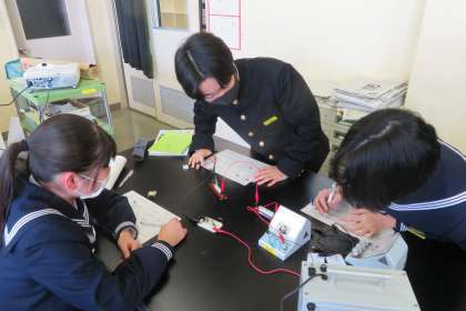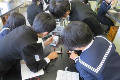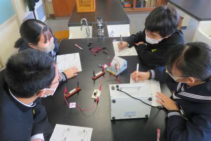 2年3組の理科は、第2理科室で、回路の電流・電圧の測定実験をしていました。
