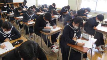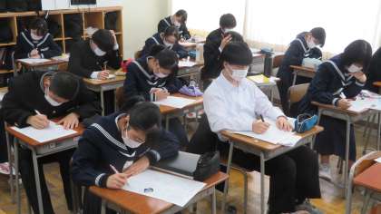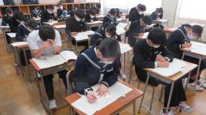 3年・授業風景 公開日 2023/02/01 更新日 2023/02/01 3学年 2月1日(水) 3限 3年生は、私立高校一般入試を明日に控え、黙々と「まとめの学習プリント」に取り組んでいます。 (写真 上:3年1組 数学) (写真 中:3年3海 理科) (写真 下:3年5組 社会)