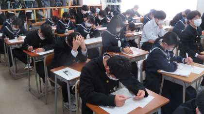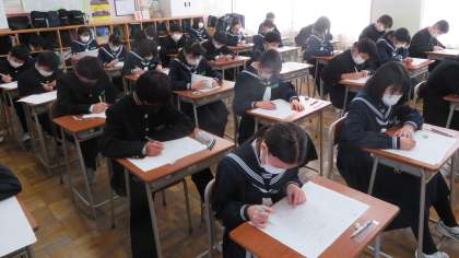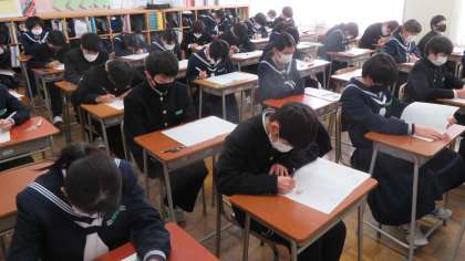 1年・実力テスト 公開日 2023/02/02 更新日 2023/02/02 1学年 2月2日(木) 2限 英語 1年生は、実力テストを行っています。 (1限:理科、2限:英語、3限:社会、4限:国語、5限:数学) (写真 上:1年1組 中:1年3組 下:1年5組) 今年度の学習を振り返る(確認する)いいチャンスになりましたか?