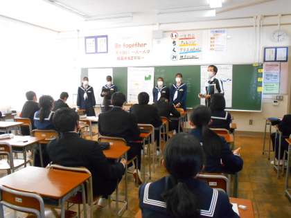 2年・総合的な学習の時間 公開日 2023/02/02 更新日 2023/02/02 2学年 2月3日(金) 6限 明日の総合的な学習の時間の学年発表に向けて、各クラスでプレゼンテーションのポイントを確認したり練習したりしています。 テーマは、「よりよい富山をつくるには」です。 明日の発表が楽しみですね! (写真 上:2年1組 中:2年2組 下:2年5組)