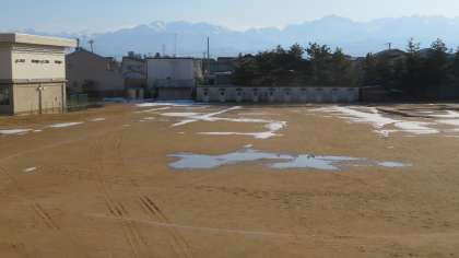 日差しが届き、寒さが和らぐと、グラウンドの雪がみるみるとけていきます。(写真)