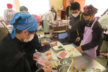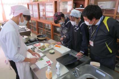 担任の堀越先生が、調理のようすを見に来ました。(写真)