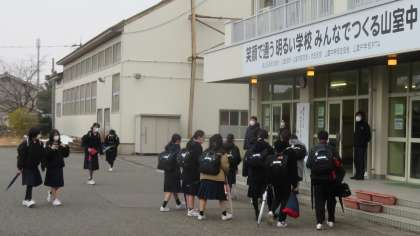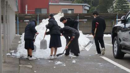 朝、ボランティアの生徒が、雪山を少しずつ崩してくれました。