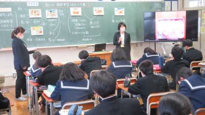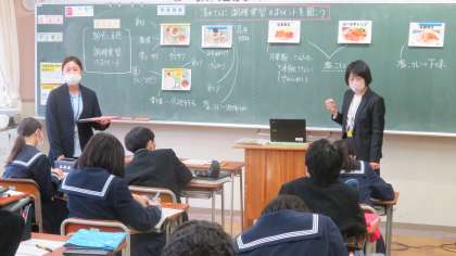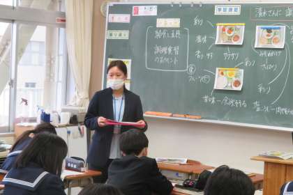 1年・家庭科・調理実習のポイント 公開日 2023/02/10 更新日 2023/02/10 1学年 2月10日(金) 6限 1年3組の家庭科は、学校栄養職員の清水さんと一緒に、「調理実習のポイント」を学習しました。 次回の調理実習のメニューは、給食献立にもある「生姜焼き」「ポークチャップ」「塩麹焼き」のいずれかを各班で選んでつくります。 生徒からは調理のポイントや給食に関する質問もたくさん出ました。 早く調理実習したいですね!