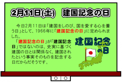 今日は、「建国記念の日」です! 公開日 2023/02/11 更新日 2023/02/11 山室中学校のページ 2月11日(土) 14:00 今日は、「建国記念の日」ということでお休みです。 といっても、土曜日なので「振替休業日」はありません。 (ちょっと1日損した気分……。)