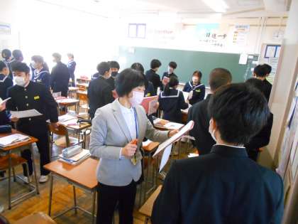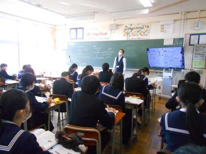 英語では、動詞の活用についてペアで問題を出し合っています。