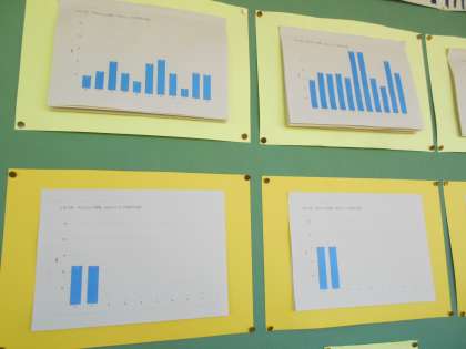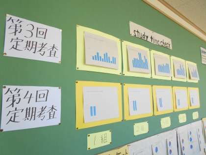 2学年掲示板には、定期考査期間中の各クラスの家庭学習時間が掲示されています。