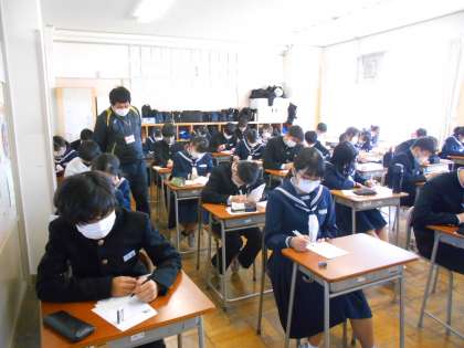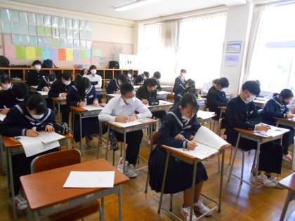 3年・授業風景 公開日 2023/02/17 更新日 2023/02/17 3学年 2月17日(金) 1限 数学では、ミニプリントでこれまでの復習をしています。 静かに集中しています。 (写真 上:3年2組) 社会ではフェアトレードについて、どのようなものか友達と話し合っています。 (写真 中:3年3組) 理科では、テスト形式でプリント学習をしています。 緊張感をもって臨んでいます。 (写真 下:3年6組)