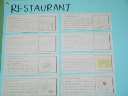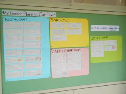 2年の掲示板には、ALTの先生に山室地区のおすすめのお店を紹介する英作文が掲示されています。